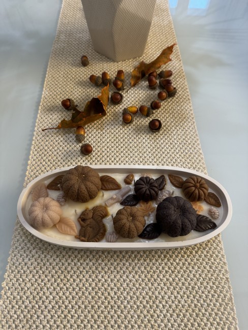 Cette composition est crée avec de la cire de soja et de la cire d'olive, de colorants naturels. et de parfum français en provenance de Grasse.