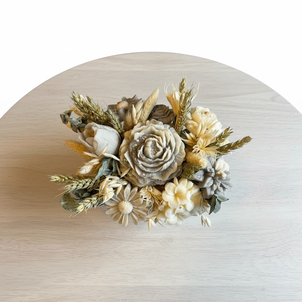 Apportez une touche de douceur et de raffinement à votre intérieur avec le bouquet parfumé “Fleur de Coton”. Élégant et apaisant, ce bouquet se compose de fleurs en cire d'olive aux teintes sobres de gris, blanc et beige et avec une touche verte d'eucalyptus. Chaque création est unique, ornée de fleurs séchées soigneusement sélectionnées à “La Rose des Vents” sur l’île d’Yeu.