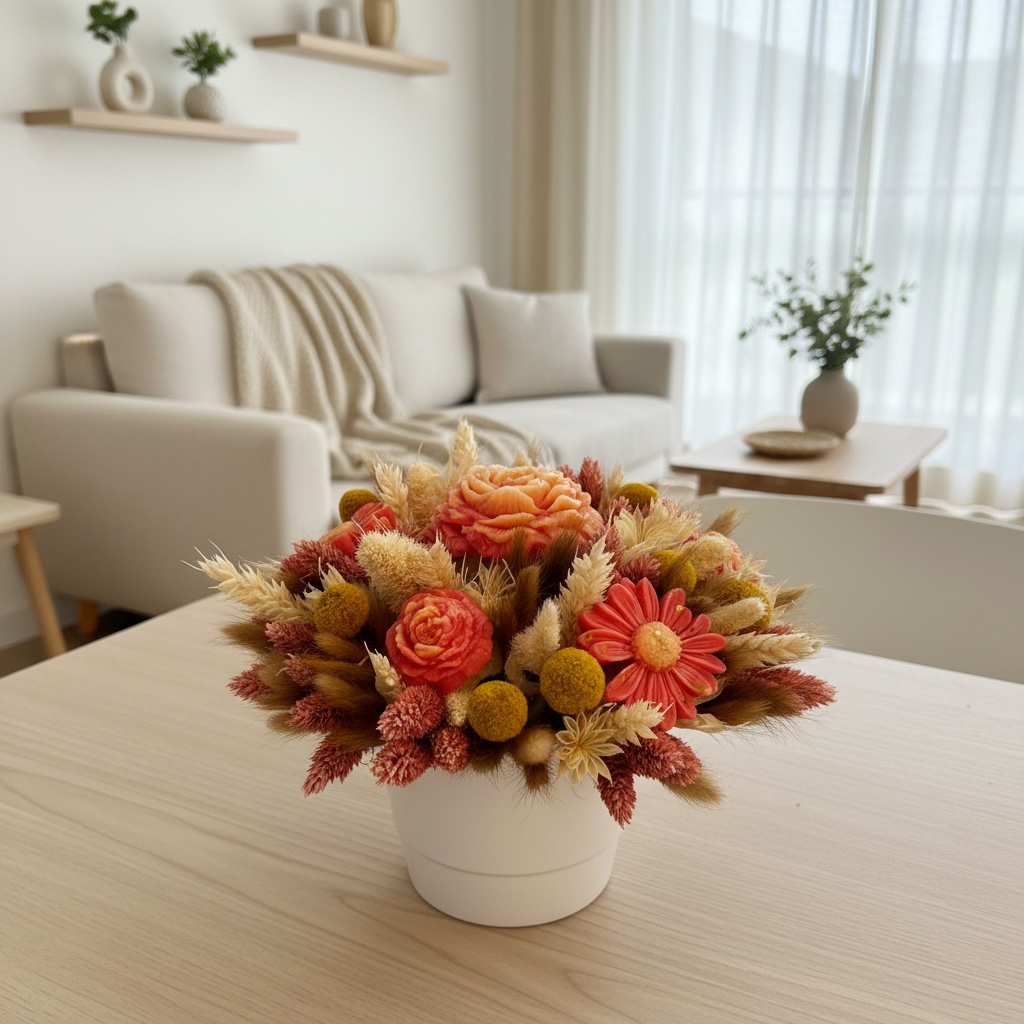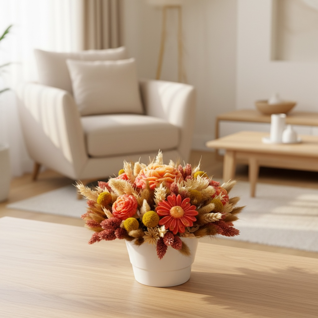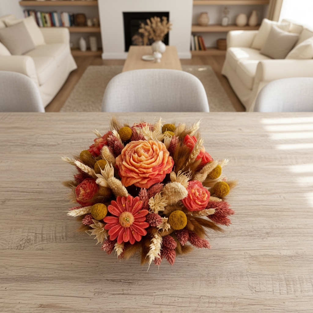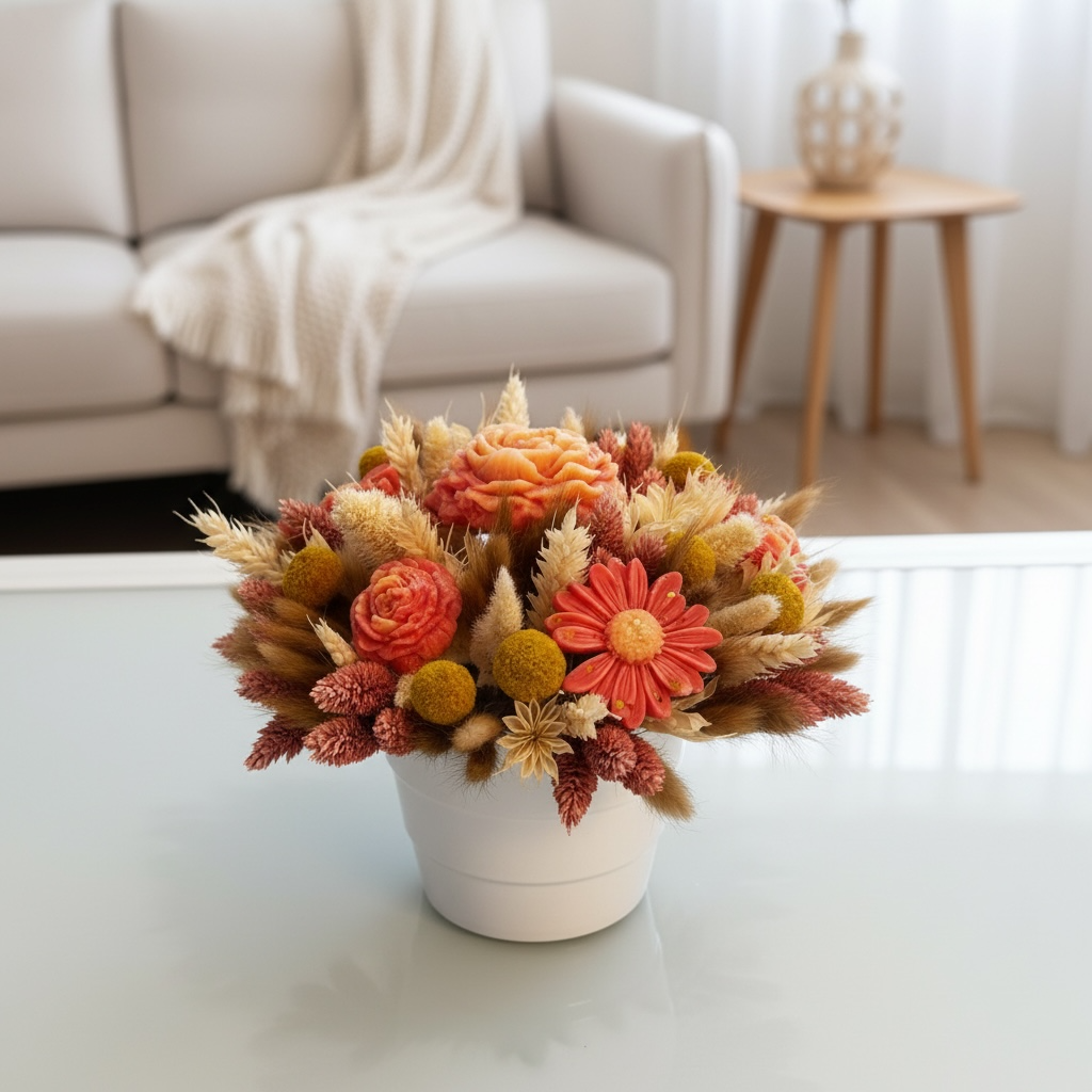 Apportez une touche gourmande et ensoleillée à votre intérieur avec le bouquet parfumé “Sucre d’Orge”. Avec ses fleurs en cire aux teintes vibrantes d’orange, de jaune et de saumon, ce bouquet évoque les friandises colorées de l’enfance. Chaque pièce est unique et décorée de fleurs séchées minutieusement choisies à “La Rose des Vents” sur l’île d’Yeu.
