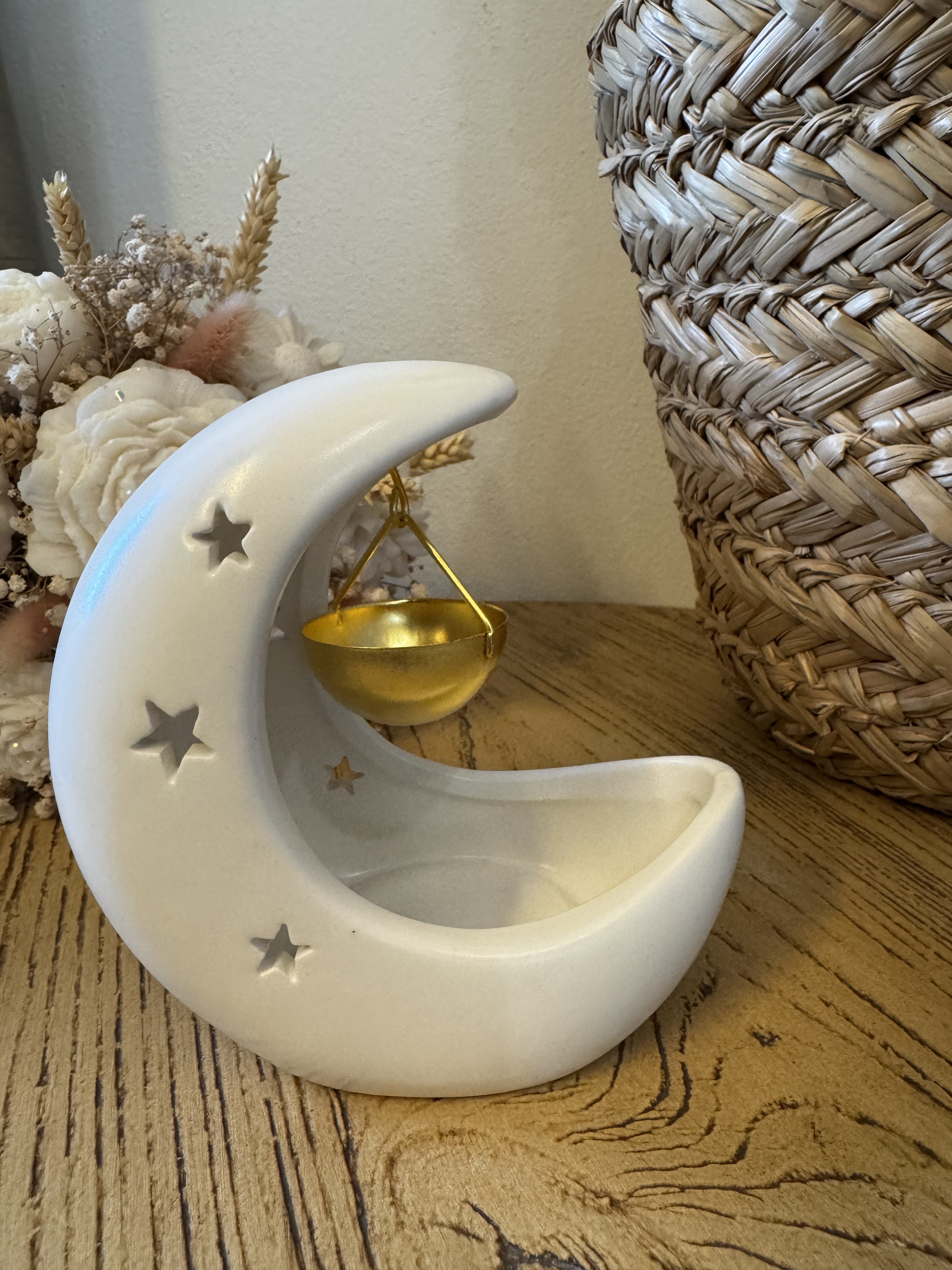 🌙 Brûleur à fondants parfumés – Lune blanche & coupelle dorée