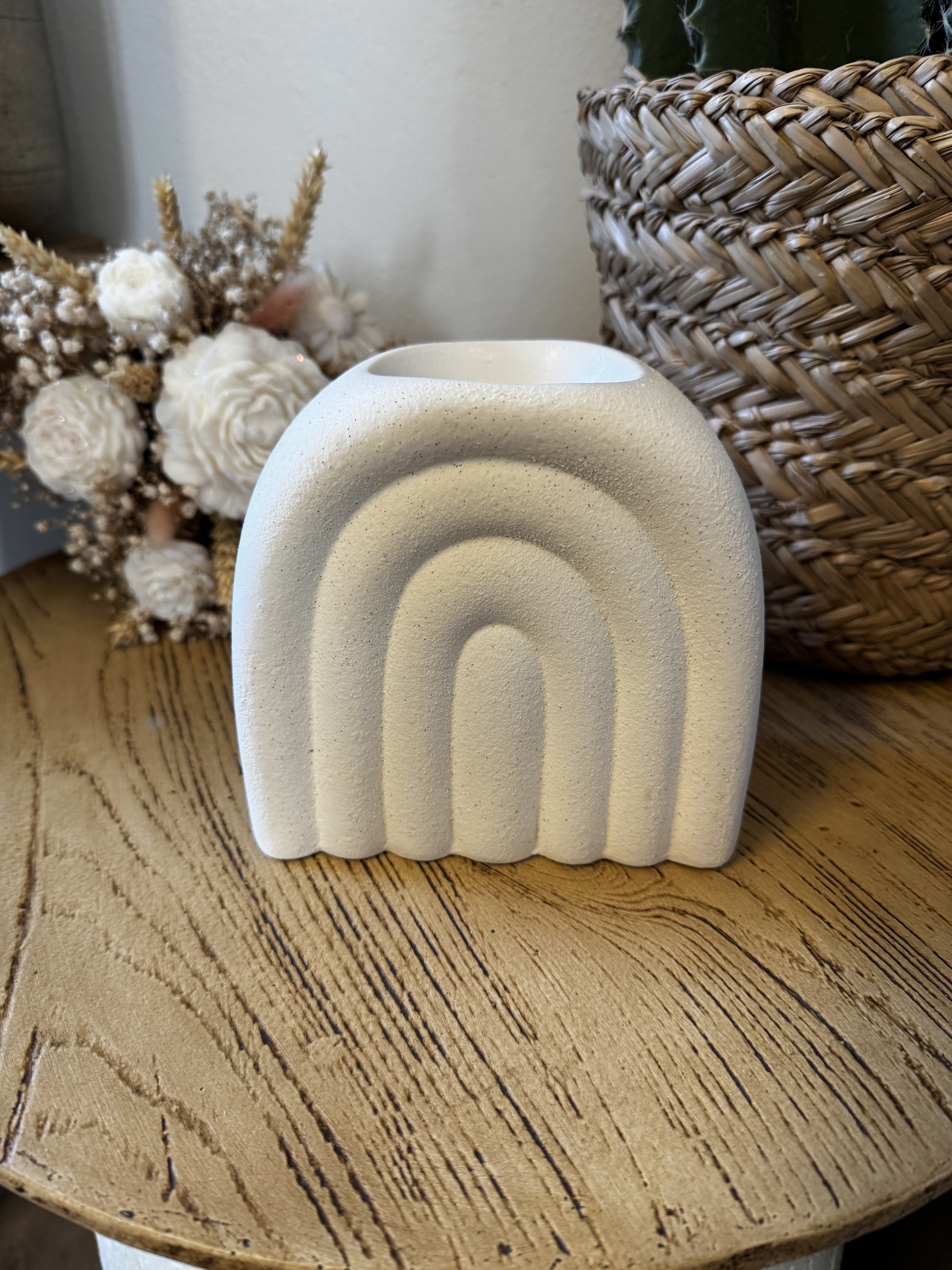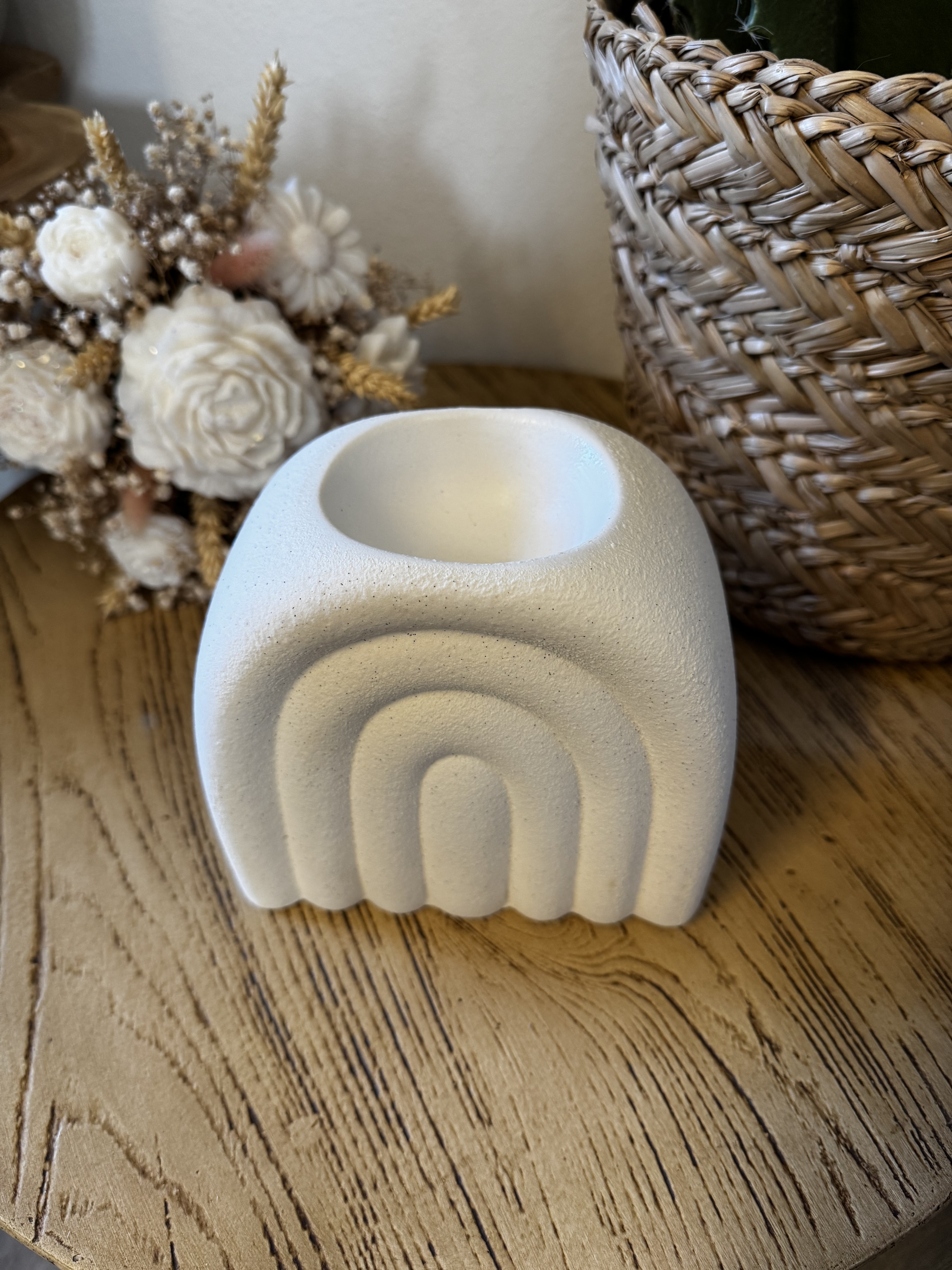 Avec sa forme en arche et son fini moucheté, il apporte une touche décorative tendance qui se marie parfaitement aux intérieurs minimalistes, scandinaves ou bohèmes. Idéal pour diffuser vos fondants parfumés tout en créant une ambiance chaleureuse et raffinée.