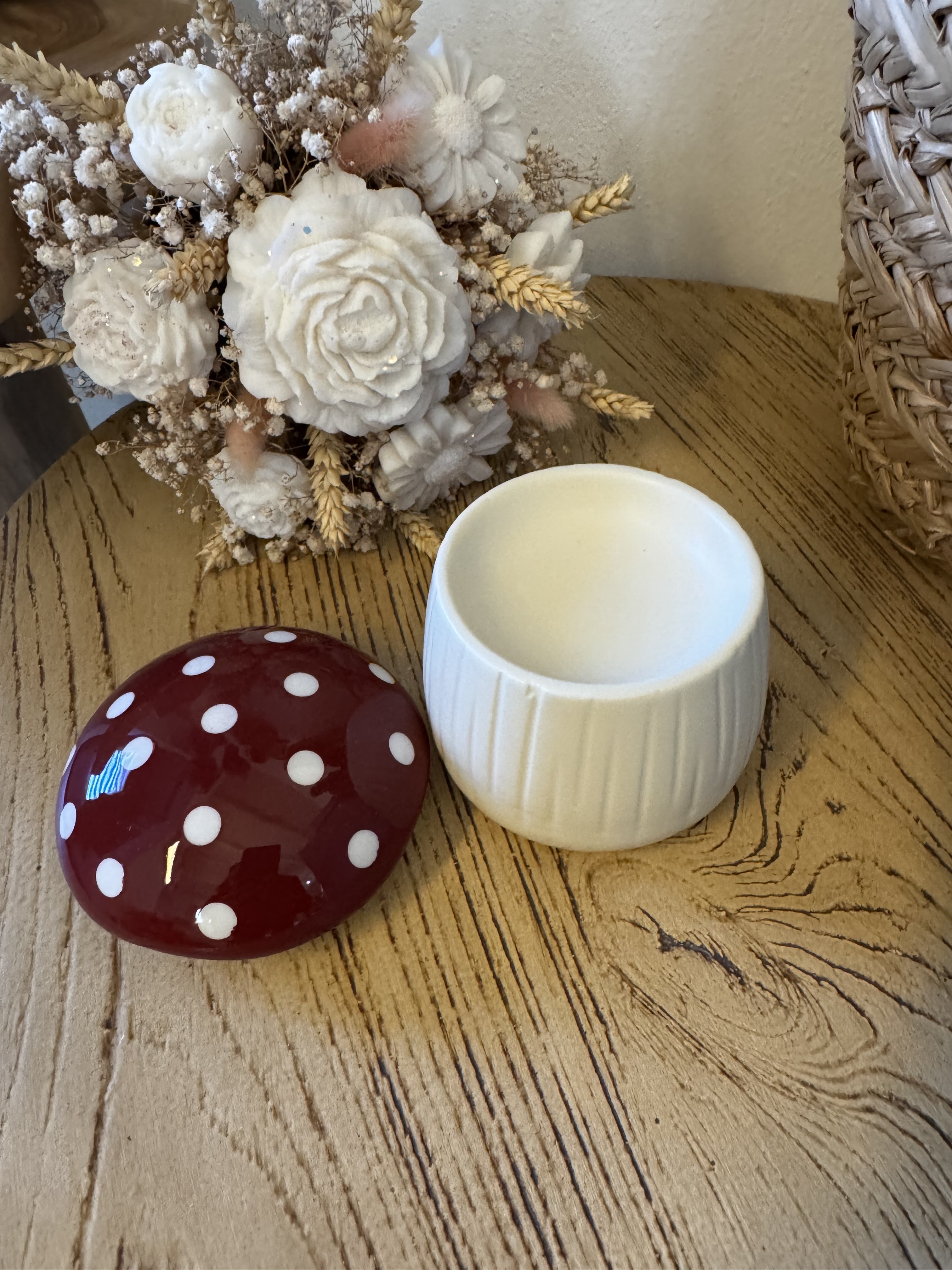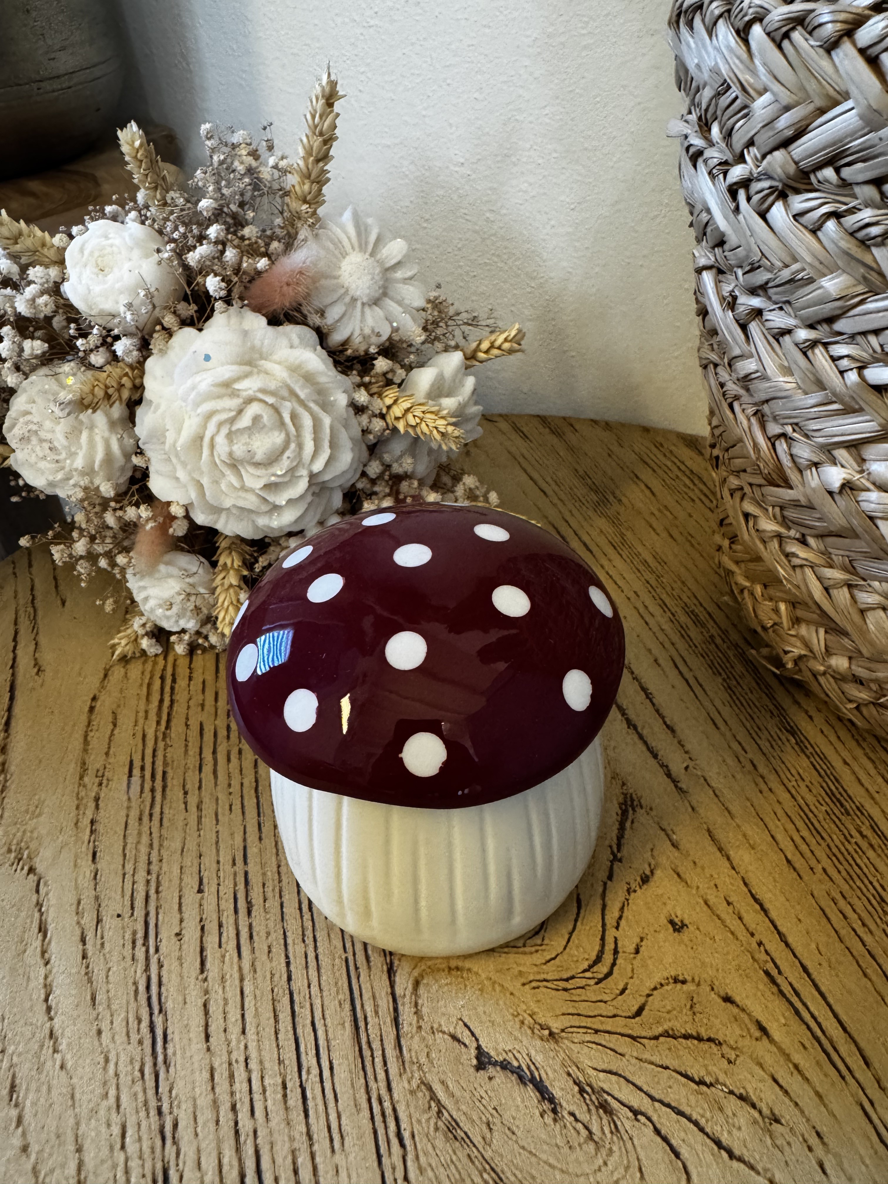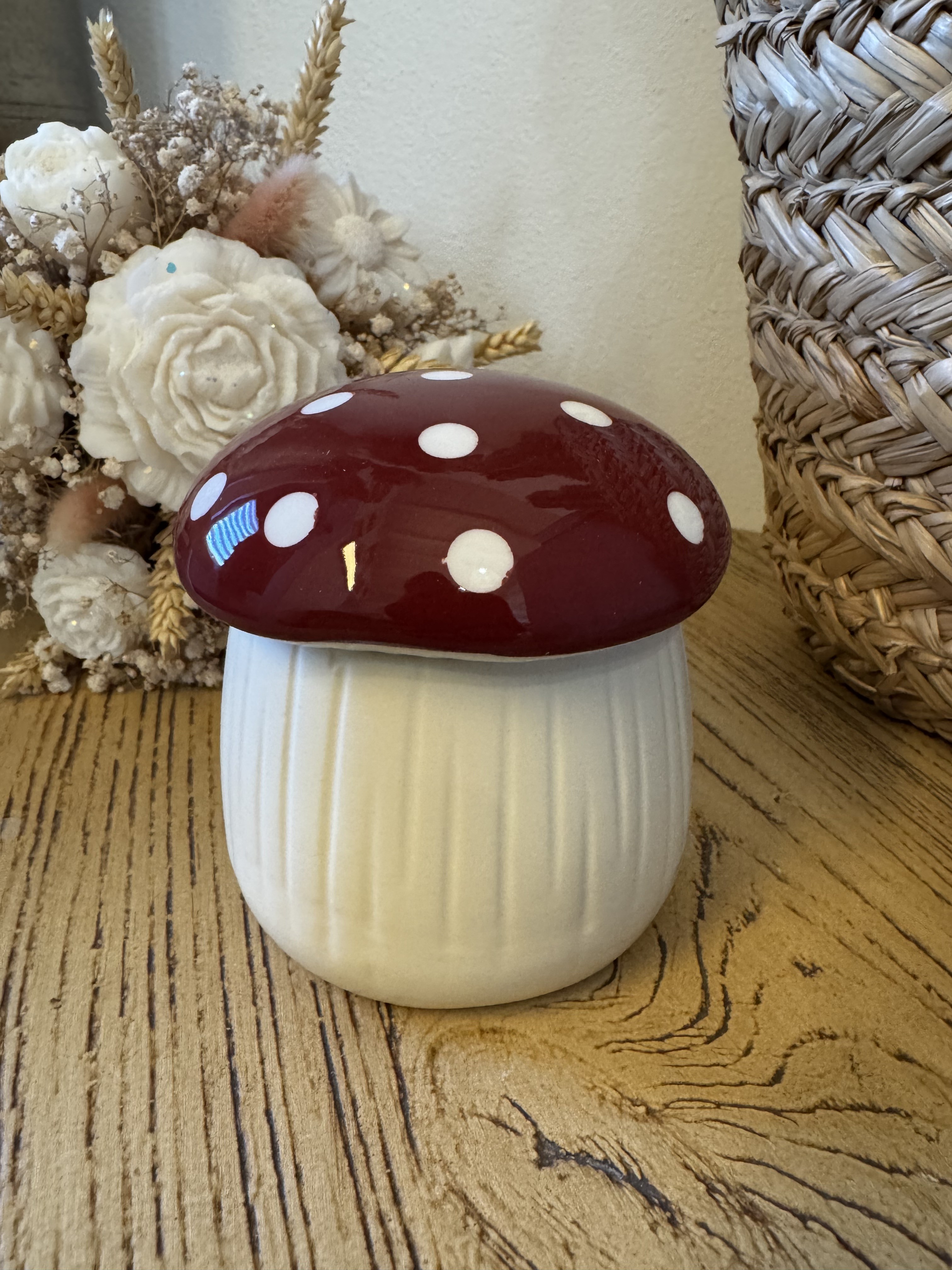 Apportez une touche féerique et originale à votre intérieur avec ce brûleur en forme de champignon. Avec son chapeau rouge à pois blancs et son corps crème, il s’inspire directement de l’univers magique des bois et des contes.