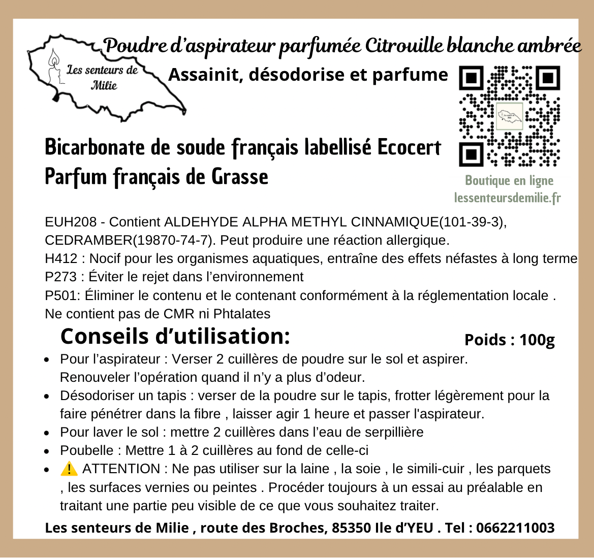 - Pour l'aspirateur : Verser 2 cuillères de poudre sur le sol et aspirer.