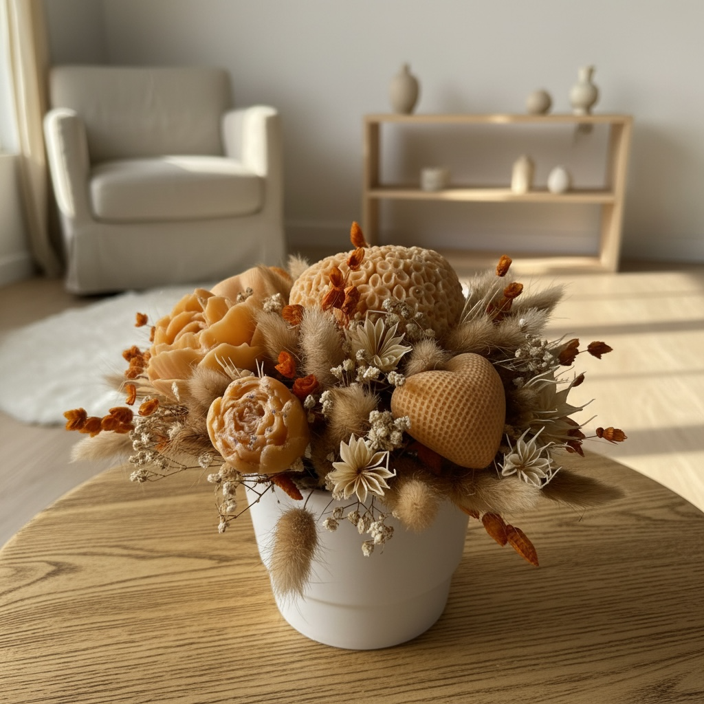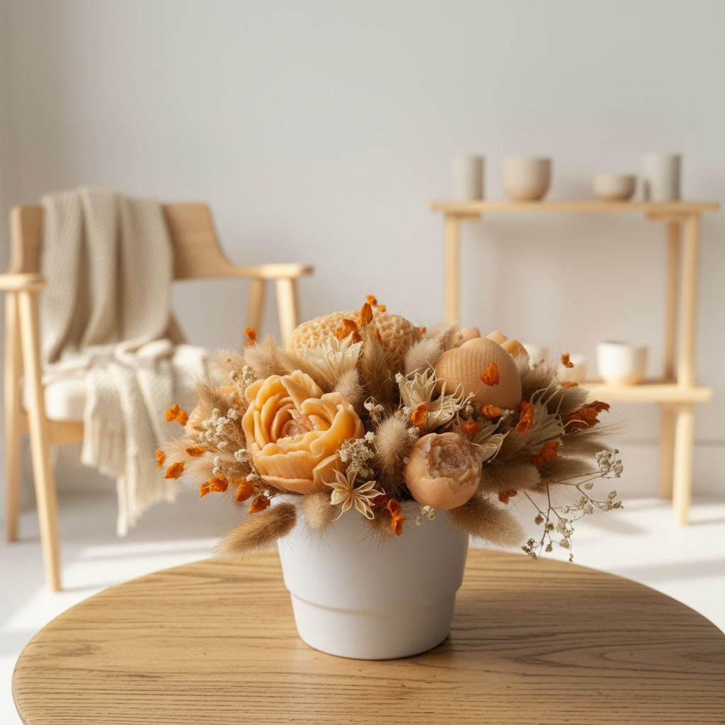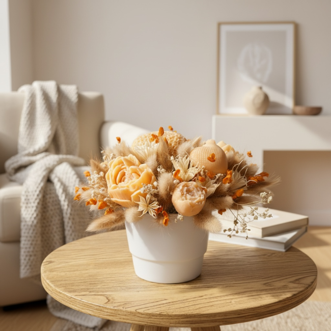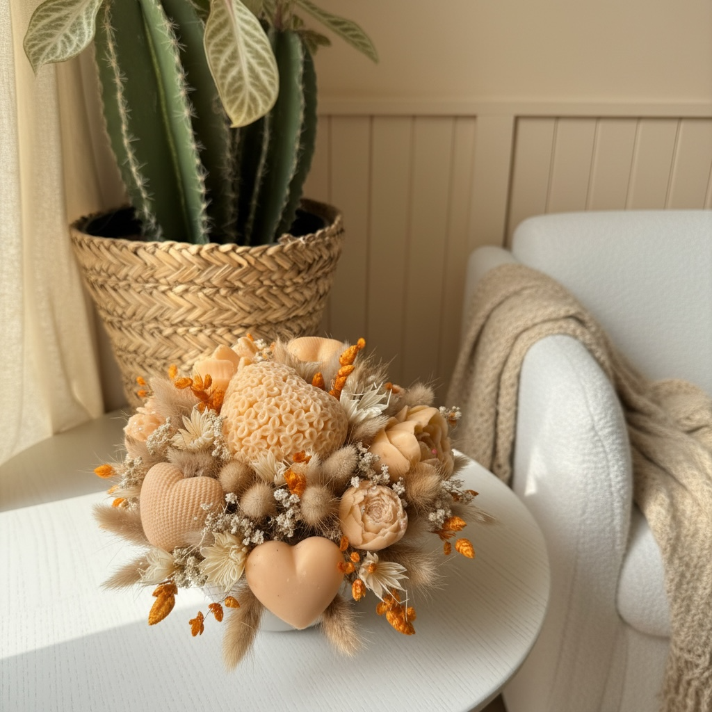 Apportez une touche chaleureuse et élégante à votre intérieur avec mon bouquet parfumé senteur Pivoine. Composé de délicates fleurs en cire aux teintes pêche & orangé, ce bouquet est sublimé par des fleurs séchées naturelles pour une création douce et raffinée.