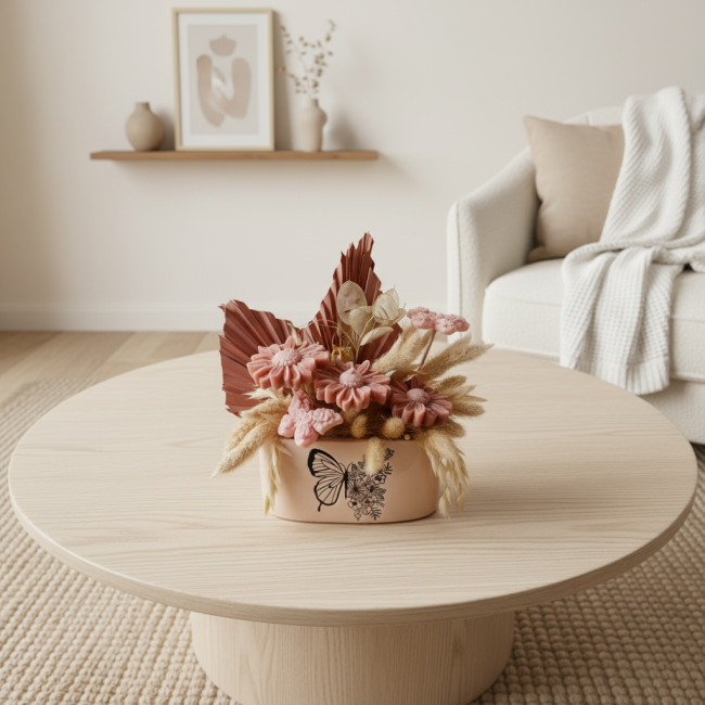 - Contenant : céramique vieux rose avec décor papillon