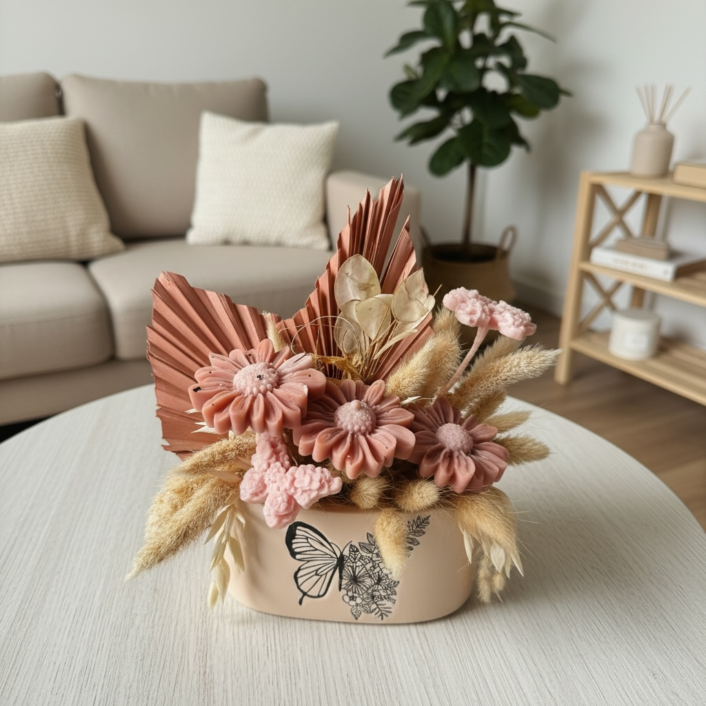 Apportez une touche de douceur et de poésie à votre intérieur avec ce bouquet parfumé senteur Pivoine. Cette création artisanale associe de délicates fleurs en cire aux teintes rosées à de jolies fleurs séchées naturelles pour une composition élégante et harmonieuse.