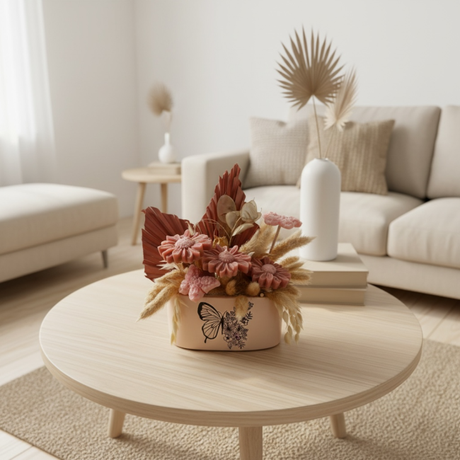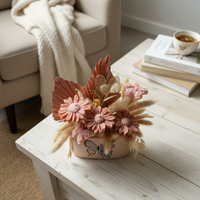 Le bouquet est présenté dans un contenant en céramique couleur vieux rose orné d’un délicat décor papillon, qui en fait à la fois un objet de décoration et un parfum d’ambiance raffiné.